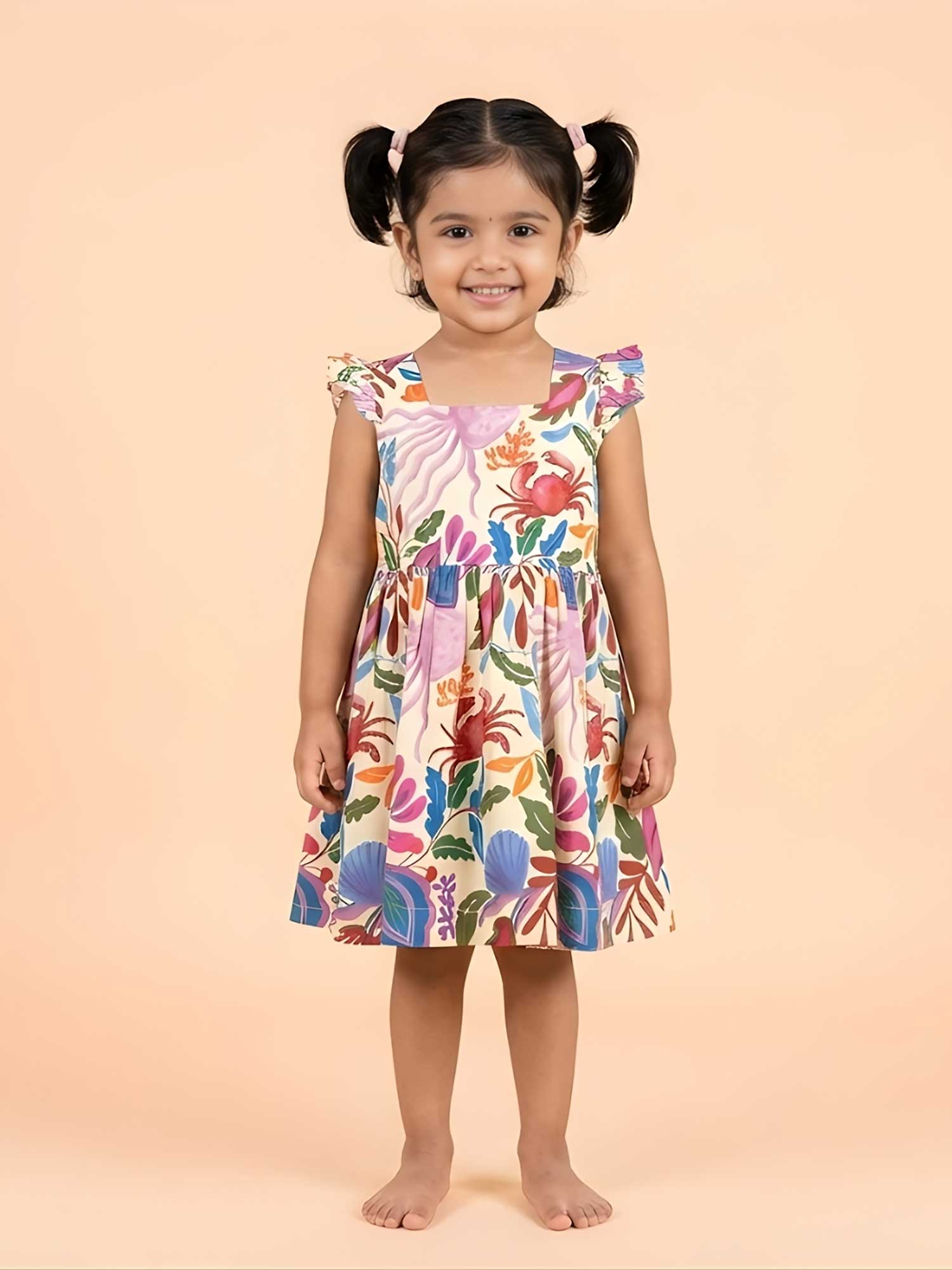Dive into a world of color and imagination with this vibrant ocean-inspired dress. Featuring playful prints of sea creatures, shells, and underwater plants, this cheerful piece brings a fun marine vibe to your little one’s wardrobe.
