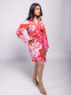 The printed mini dress features a one-shoulder with a balloon sleeve and a flowy silhouette. The dress has pockets on both sides for added comfort.