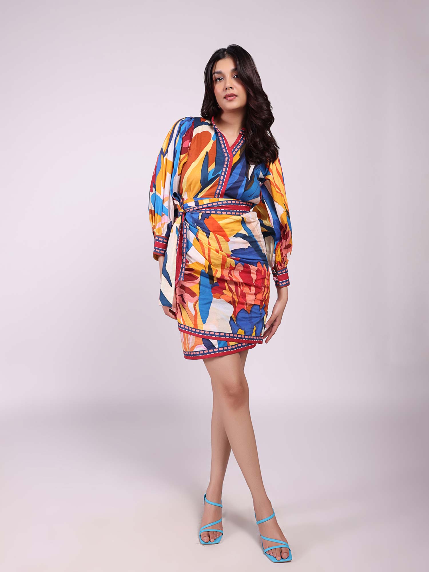This printed dress features a mandarin collar with full balloon sleeves and a wrap-around tie-up detail at the waist, making it feminine and stylish.
