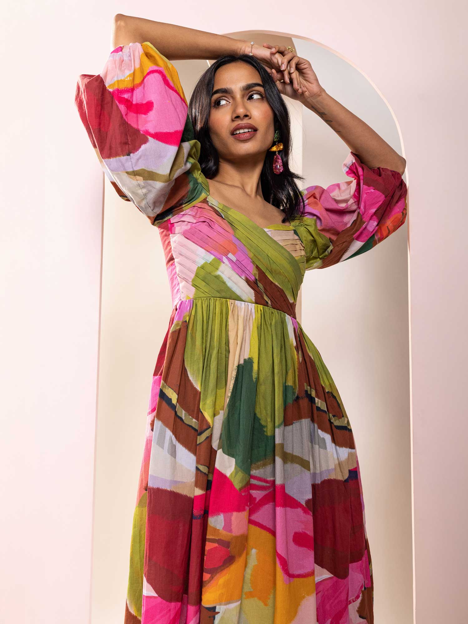 This dress features a crisscross pleated bust with balloon sleeves that can be worn on or off the shoulder and a smocked back for all-day comfort.