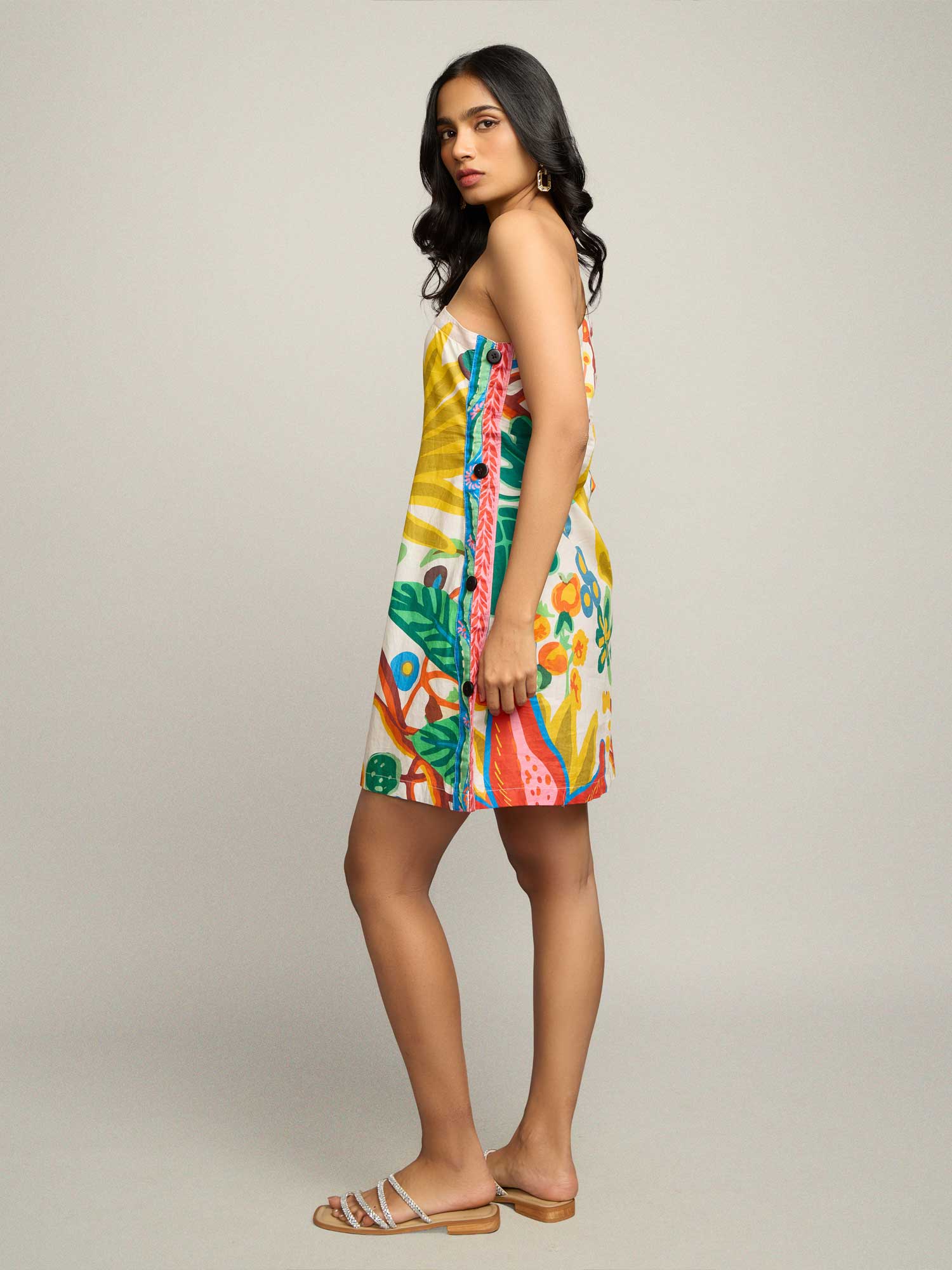 This fun printed mini dress features a playful one-shoulder detail with elasticated balloon sleeves. Finished with cute wooden button detailing along the side, this dress is effortlessly charming and perfect for beach days and sunny outings.