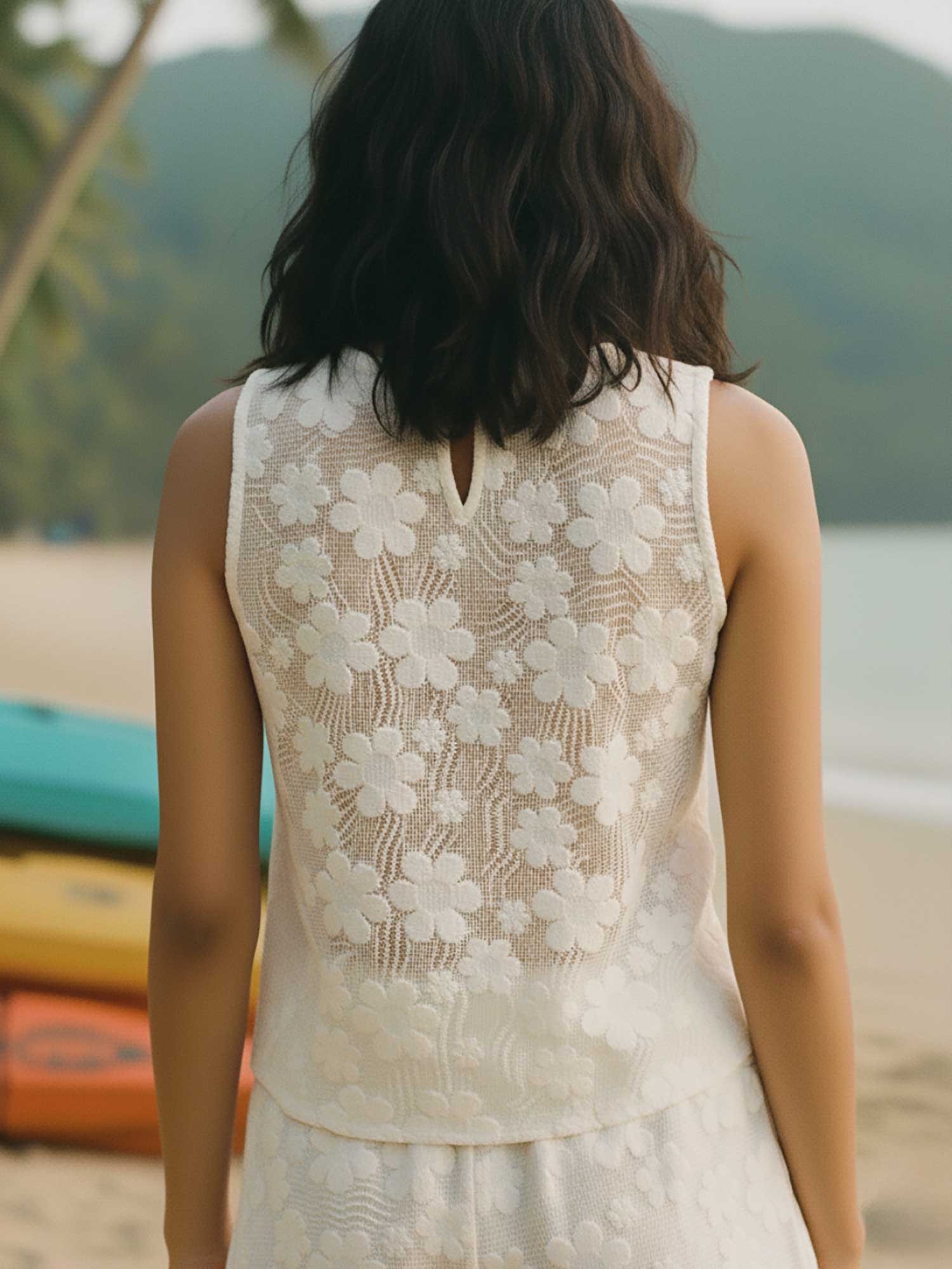This cotton crochet co-ord set features a sleeveless top with a flattering U-neckline and a delicate loop button closure at the back. Paired with relaxed-fit shorts designed with an elastic waistband and functional pockets, this two-piece set is effortless, stylish, and easy to wear.