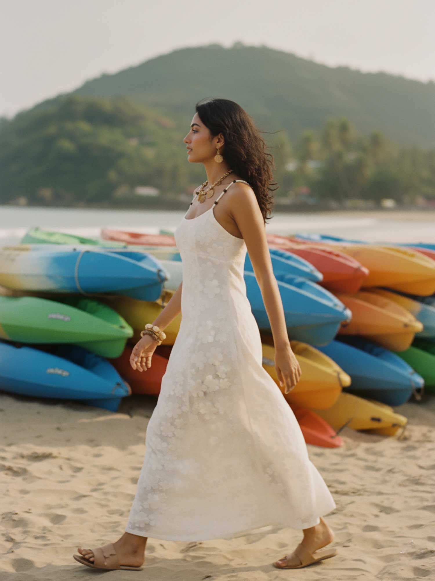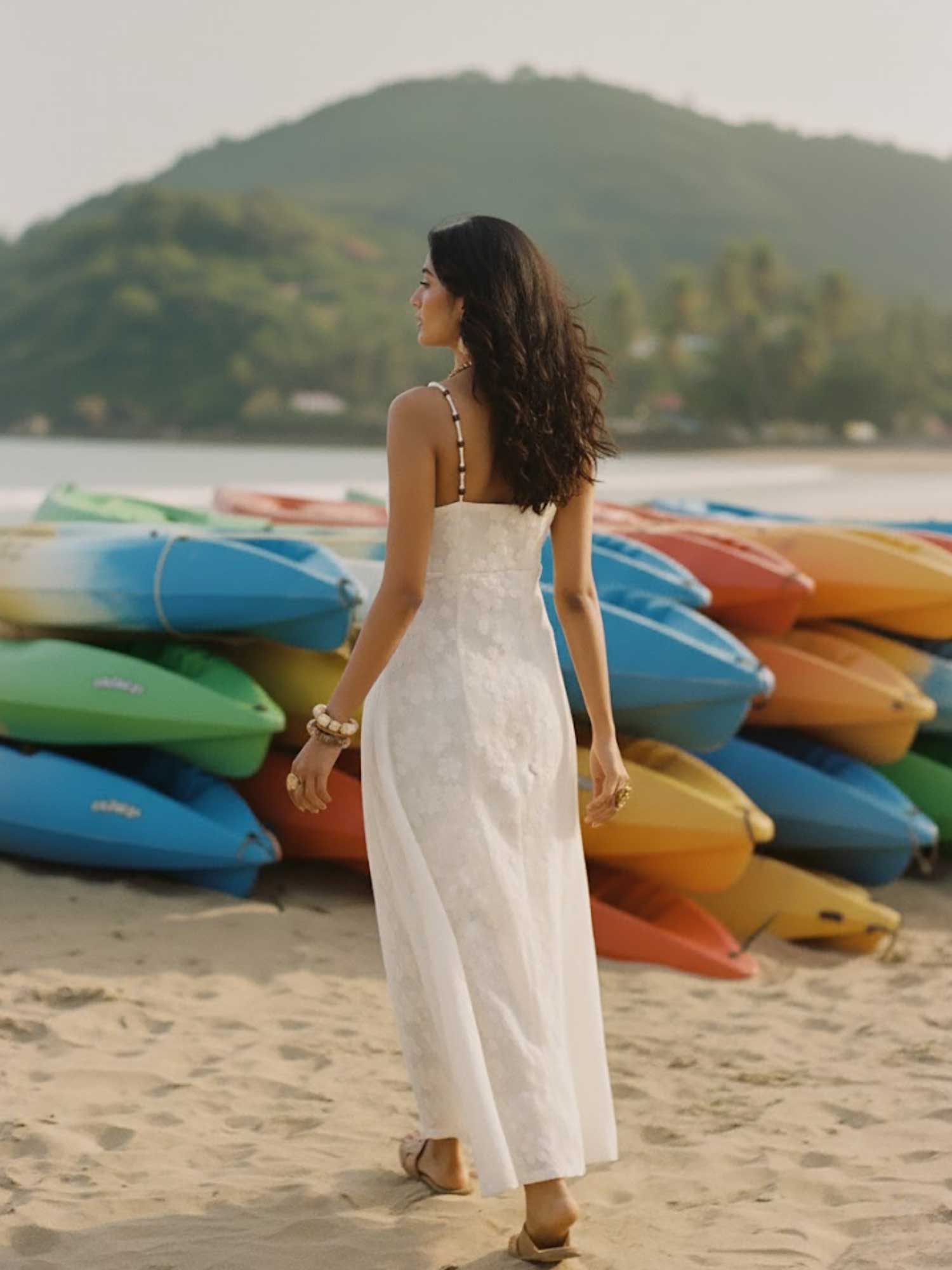 This cotton crochet printed dress features a flattering U-neckline with delicate beaded straps and a flowy A-line silhouette that looks beautiful on all body types. Lightweight and breezy, it’s the perfect pick for beach days and summer holidays.