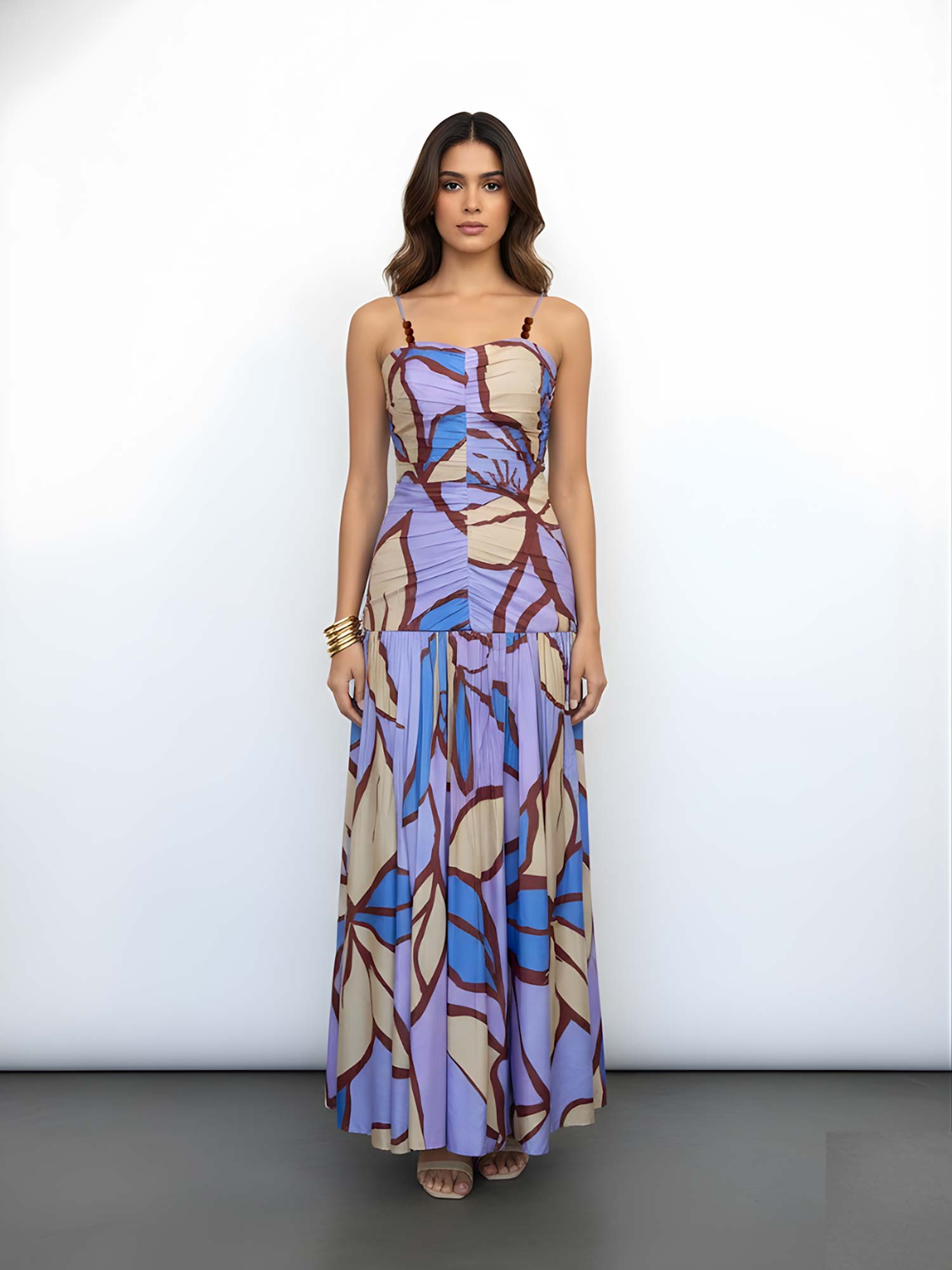 This stunning printed maxi dress is flowy and feminine, featuring noodle beaded straps, a v-neckline, and ruching detail till the lower waist, after which the skirt is ruched and flary. It looks great on all body types and is the perfect addition to your wardrobe!