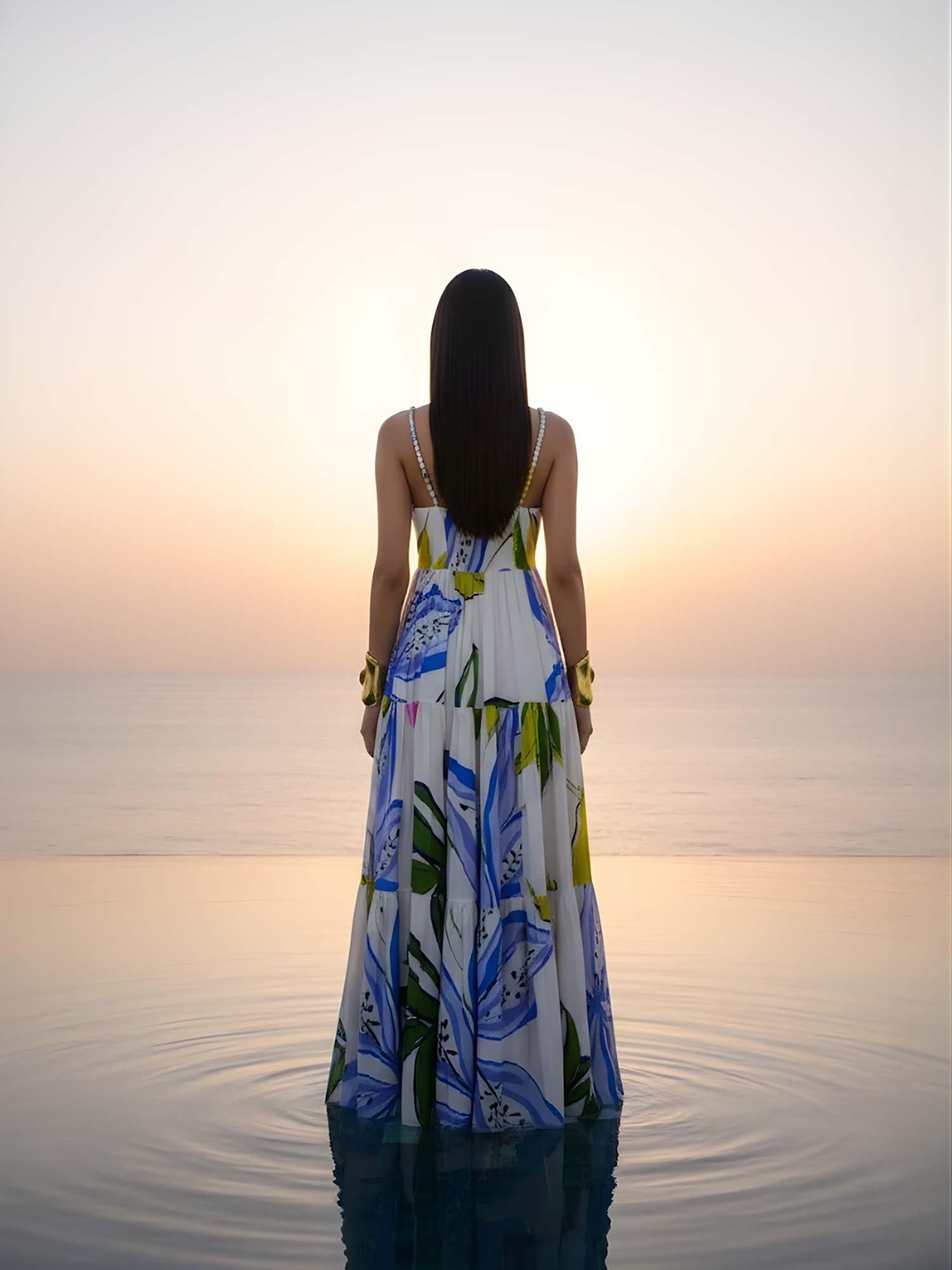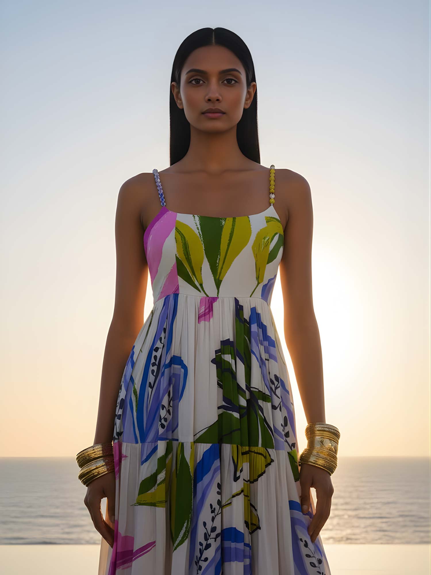 This elegant abstract printed maxi dress features delicate Beaded cushioned straps straps and a softly contoured bodice that flows into a breezy, tiered silhouette. Designed for effortless movement, the dress drapes beautifully with a fluid fall, making it a perfect choice for resort wear, sundowners, or elevated day occasions. The lightweight fabric and relaxed fit ensure all-day comfort while maintaining a refined, modern aesthetic.