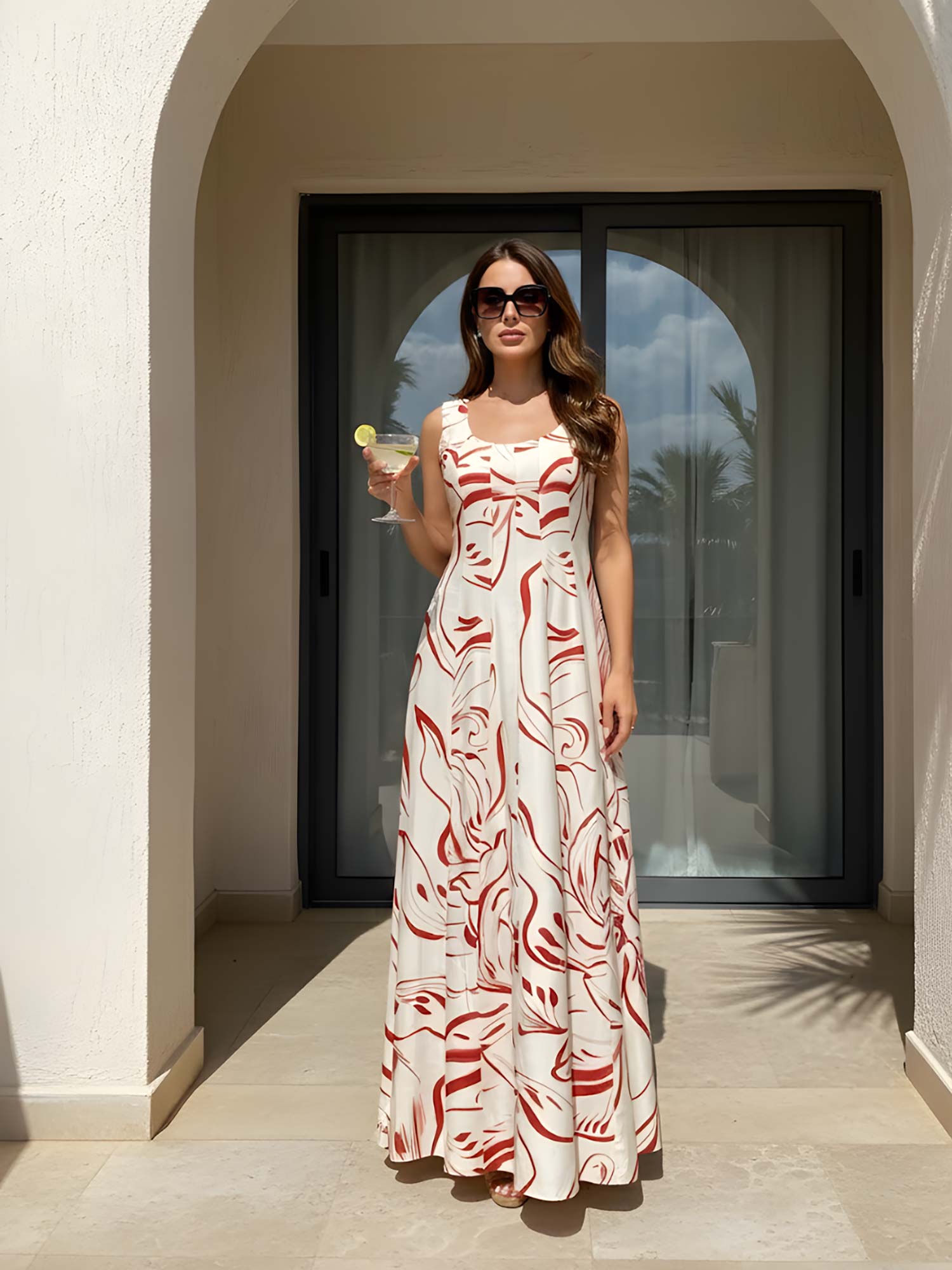 The white and red printed dress features sleeveless with a round neckline and long panels running through the front and back, creating a flared and feminine silhouette.